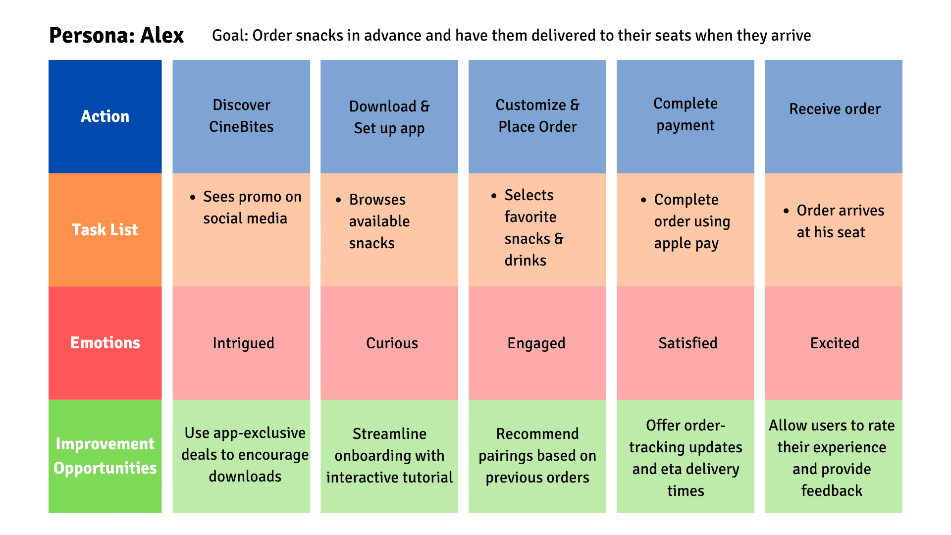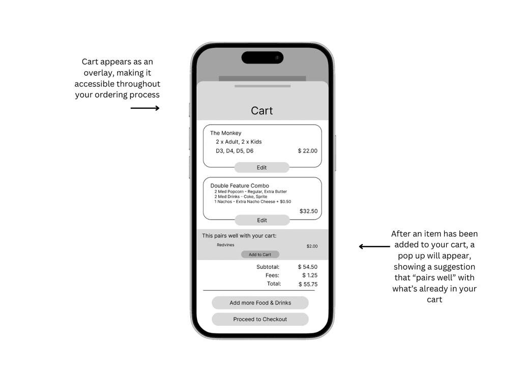 Goal: To design an intuitive, user-friendly app that allows moviegoers to browse, customize, and order snacks seamlessly, reducing wait times and enhancing convenience through seat delivery or express pickup options