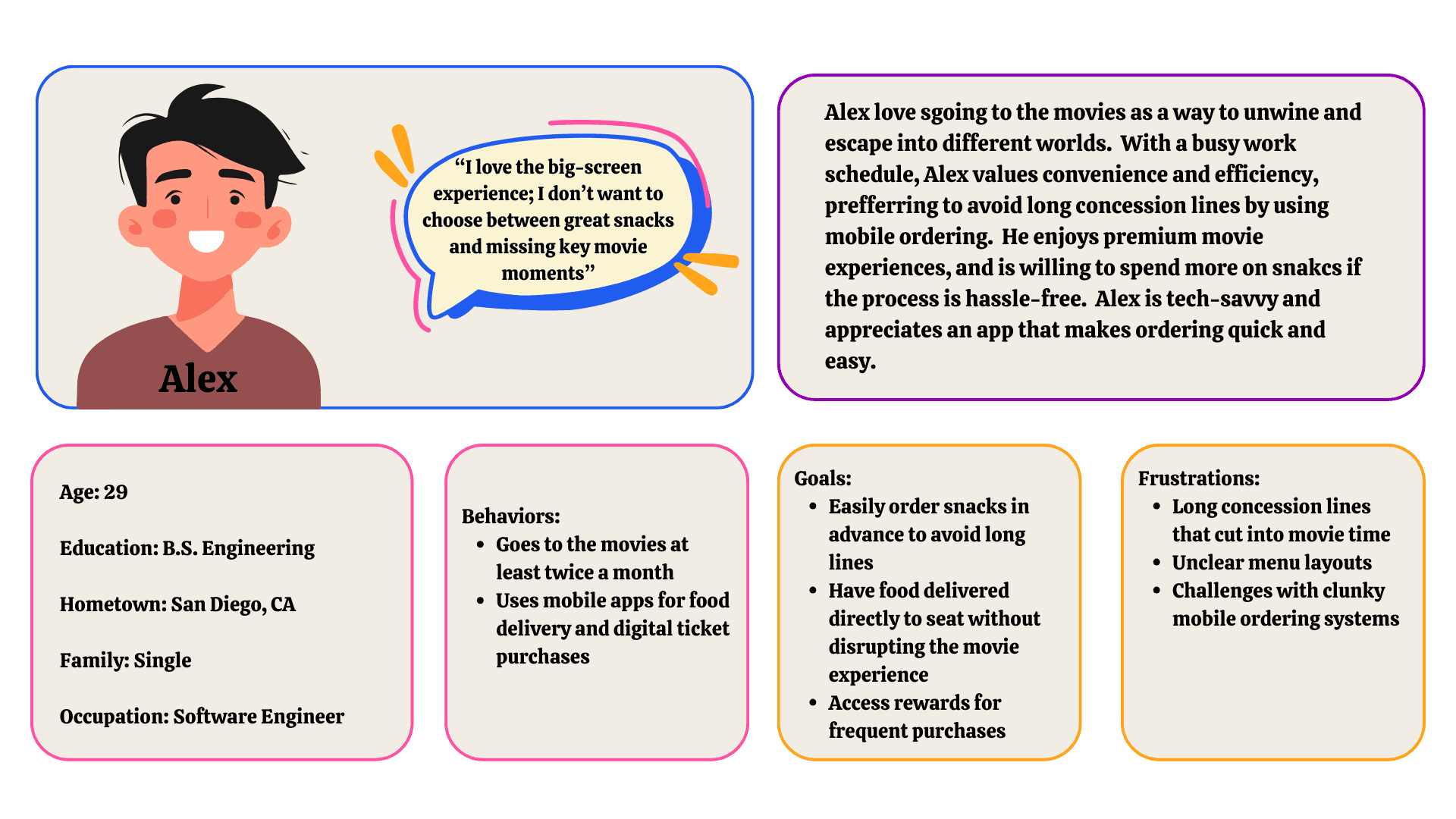 Alex is a tech-savvy movie lover who values convenience and efficiency in all aspects of life. He enjoys premium movie experiences and hates missing key moments due to long concession lines. His goal with the CineBites app is to seamlessly order snacks in advance or from his seat, ensuring a hassle-free experience that lets him focus on the film. He appreciates intuitive design, real-time updates, and personalized recommendations that enhance his overall moviegoing experience