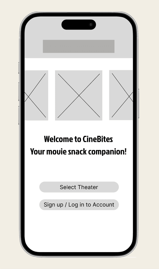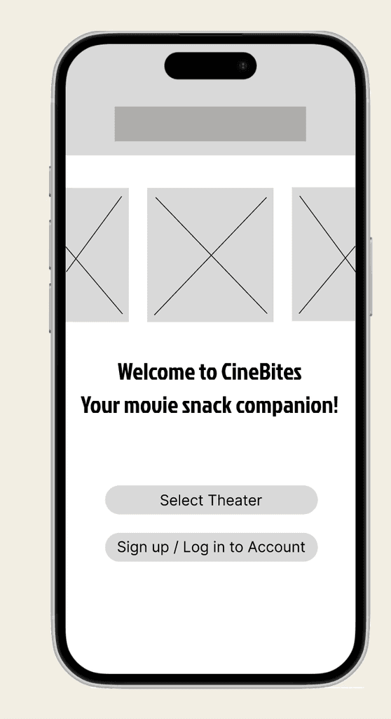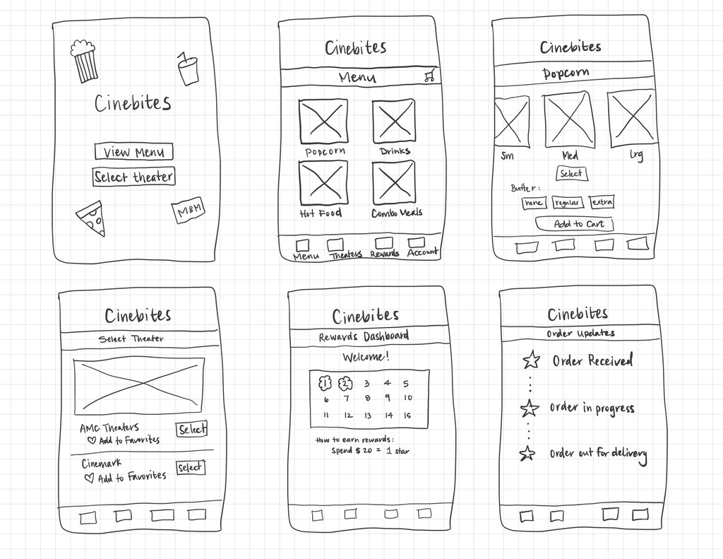 After refining ideas from the paper wireframes, I created digital wireframes in Figma to establish the core layout and functionality of CineBites. These wireframes focused on optimizing the user flow for browsing snacks, customizing orders, and completing checkout efficiently. Key elements, such as intuitive navigation, clear call-to-action buttons, and a streamlined ordering process, were prioritized to enhance the overall user experience.