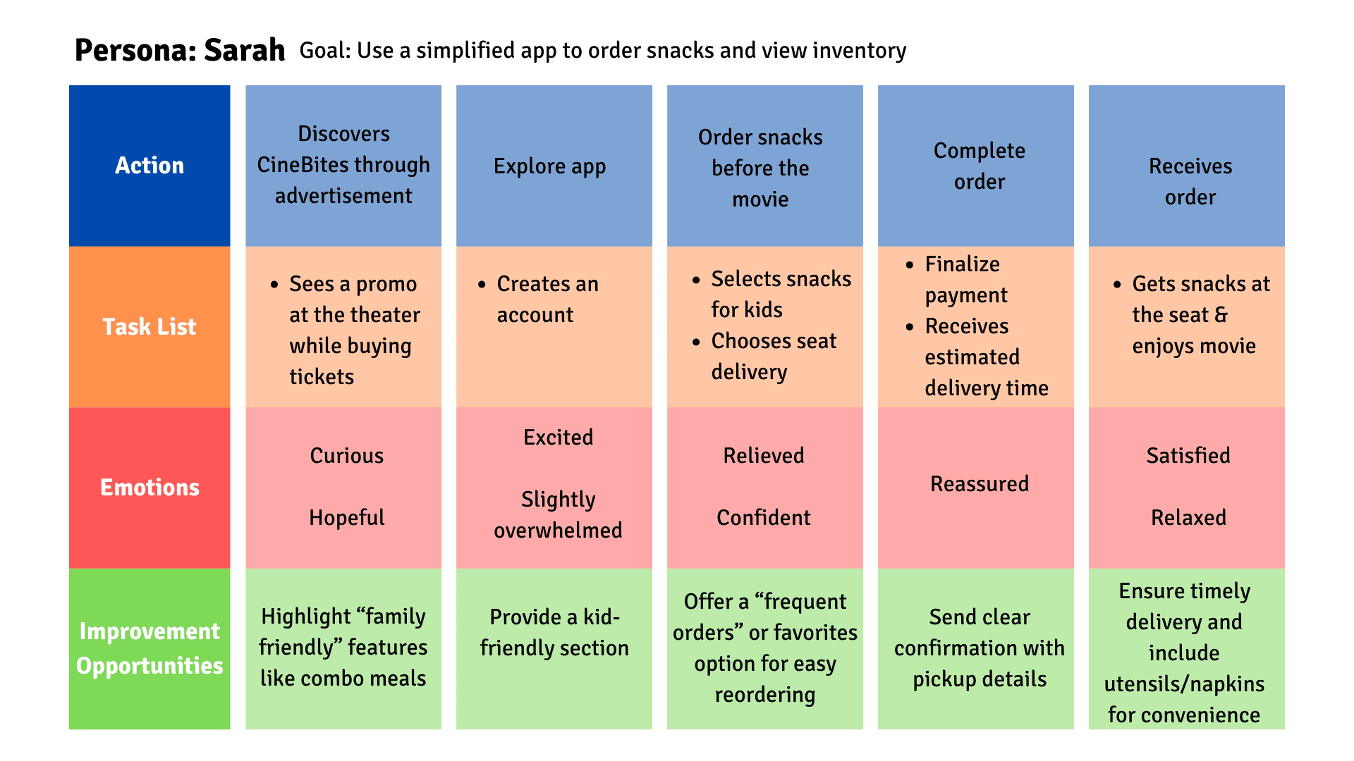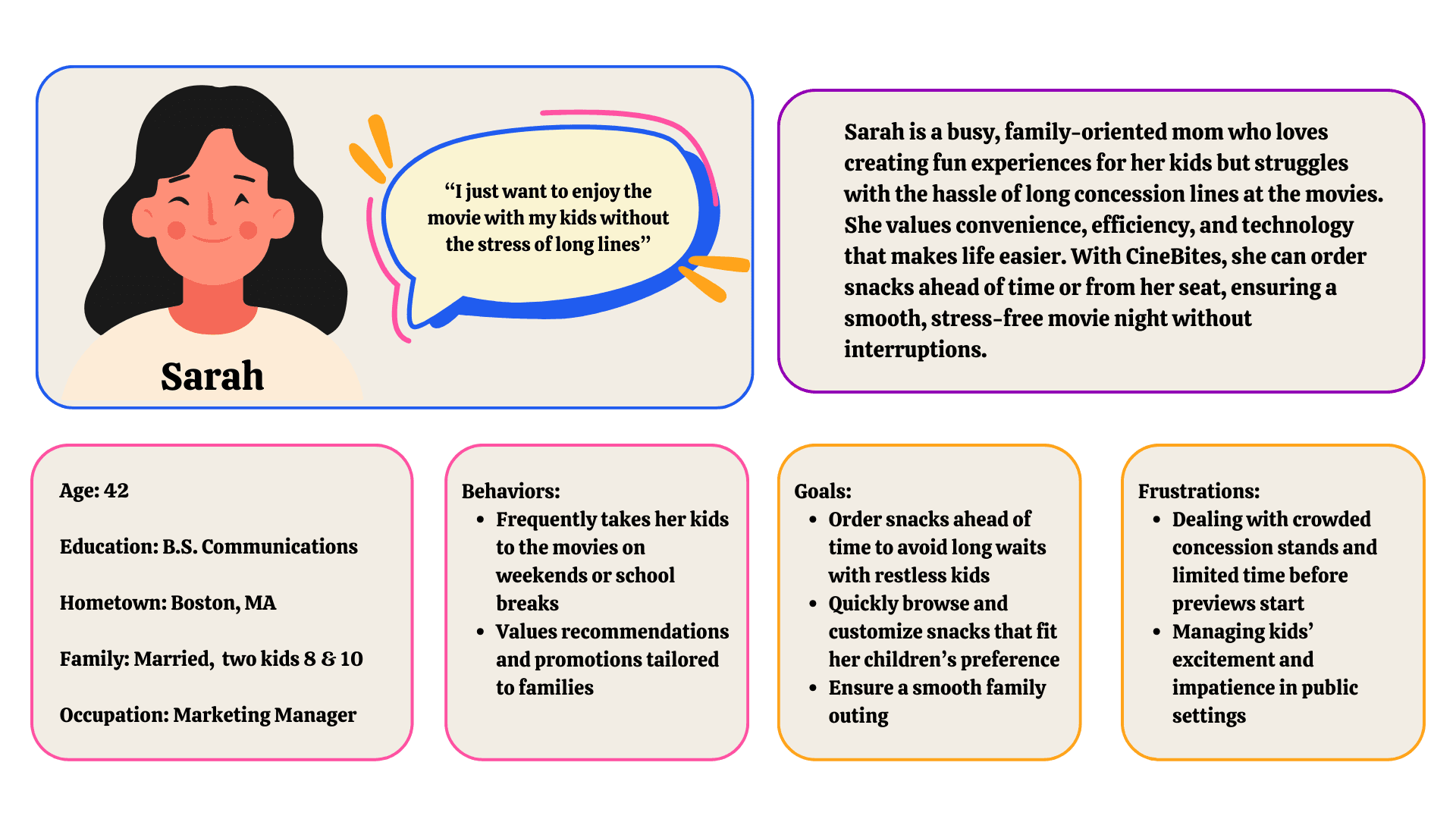 Sarah is a loving and practical mom who enjoys taking her kids to the movies but dislikes the chaos of concession lines. She values efficiency and convenience, always looking for ways to make family outings smoother. She wants a hassle-free way to order snacks without missing key movie moments. CineBites gives her the control she needs, allowing her to plan ahead or order from her seat, so she can focus on making memories with her kids